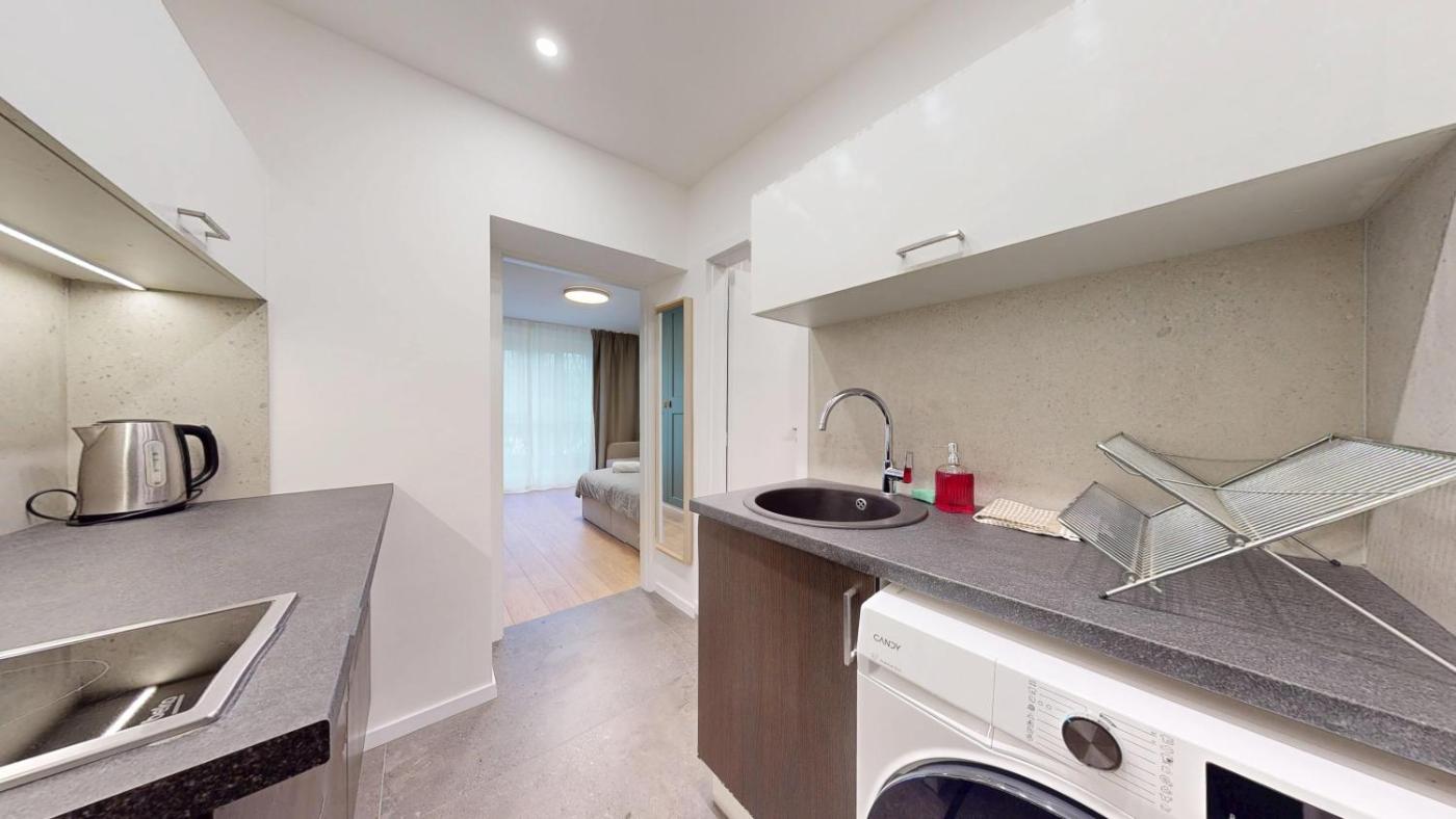 One-Bedroom Apartment. The air-conditioned apartment features 1 bedroom and 1 bathroom with a shower and a hairdryer. The well-fitted kitchen has a stovetop, a refrigerator, kitchenware and an electric kettle. The apartment offers a washing machine, soundproof walls, a seating area, a flat-screen TV with streaming services, as well as city views. The unit offers 2 beds.