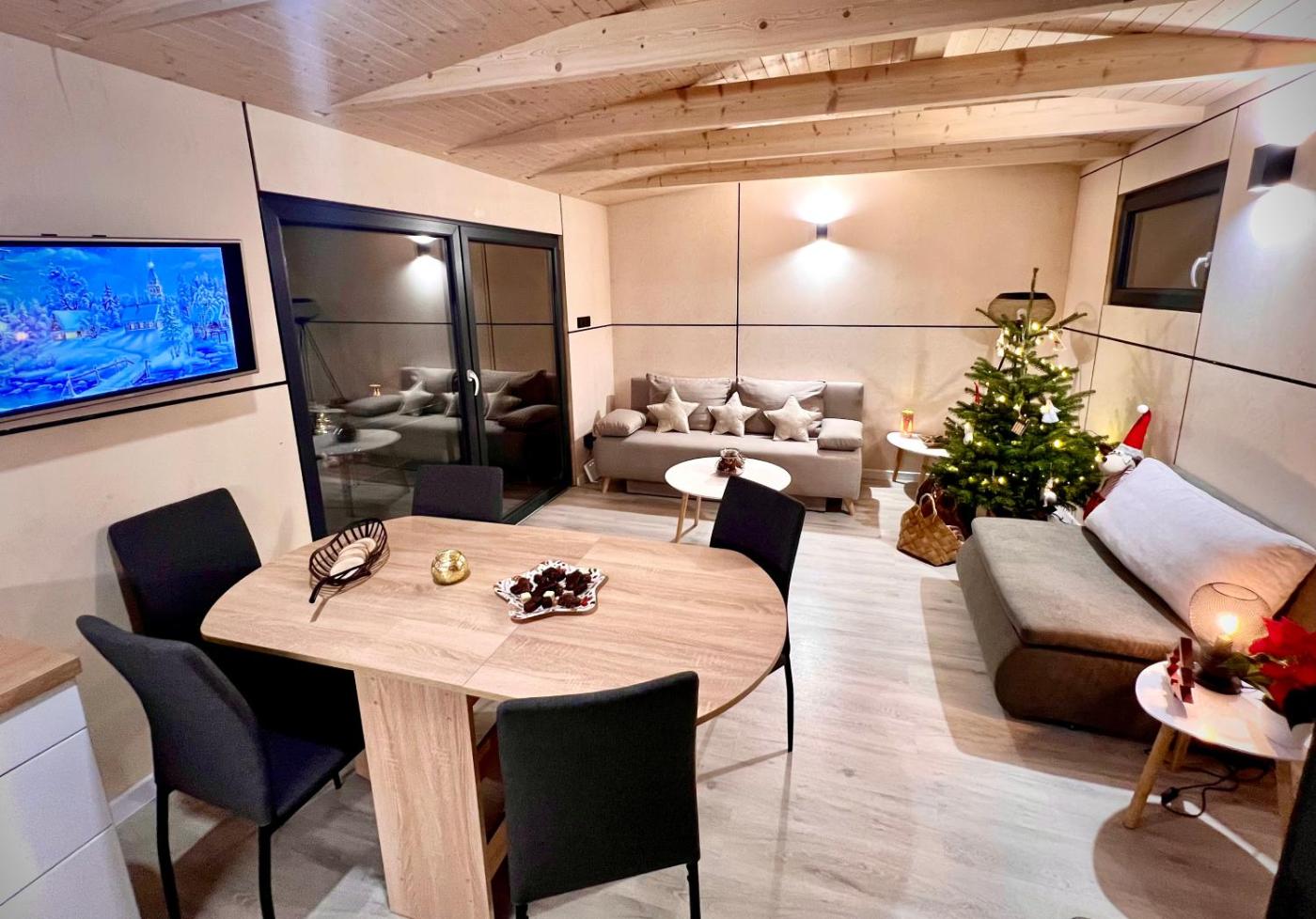 One-Bedroom Chalet. This luxurious chalet has a pool with a view, a hot tub and a spa bath. Boasting a private entrance, this chalet comes with 1 living room, 1 separate bedroom and 1 bathroom with a shower and a hairdryer. Guests will find a stovetop, a refrigerator, a dishwasher and kitchenware in the well-fitted kitchen. The chalet also includes a barbecue. Featuring a terrace with garden views, this chalet also features a tea and coffee maker and a flat-screen TV with streaming services. The unit has 4 beds.