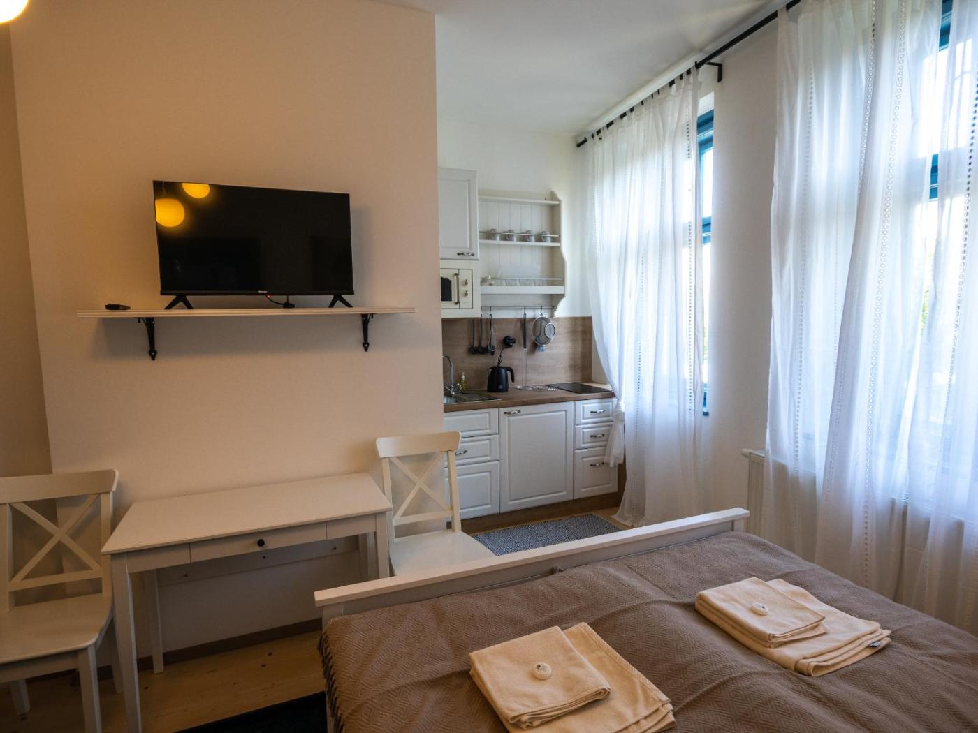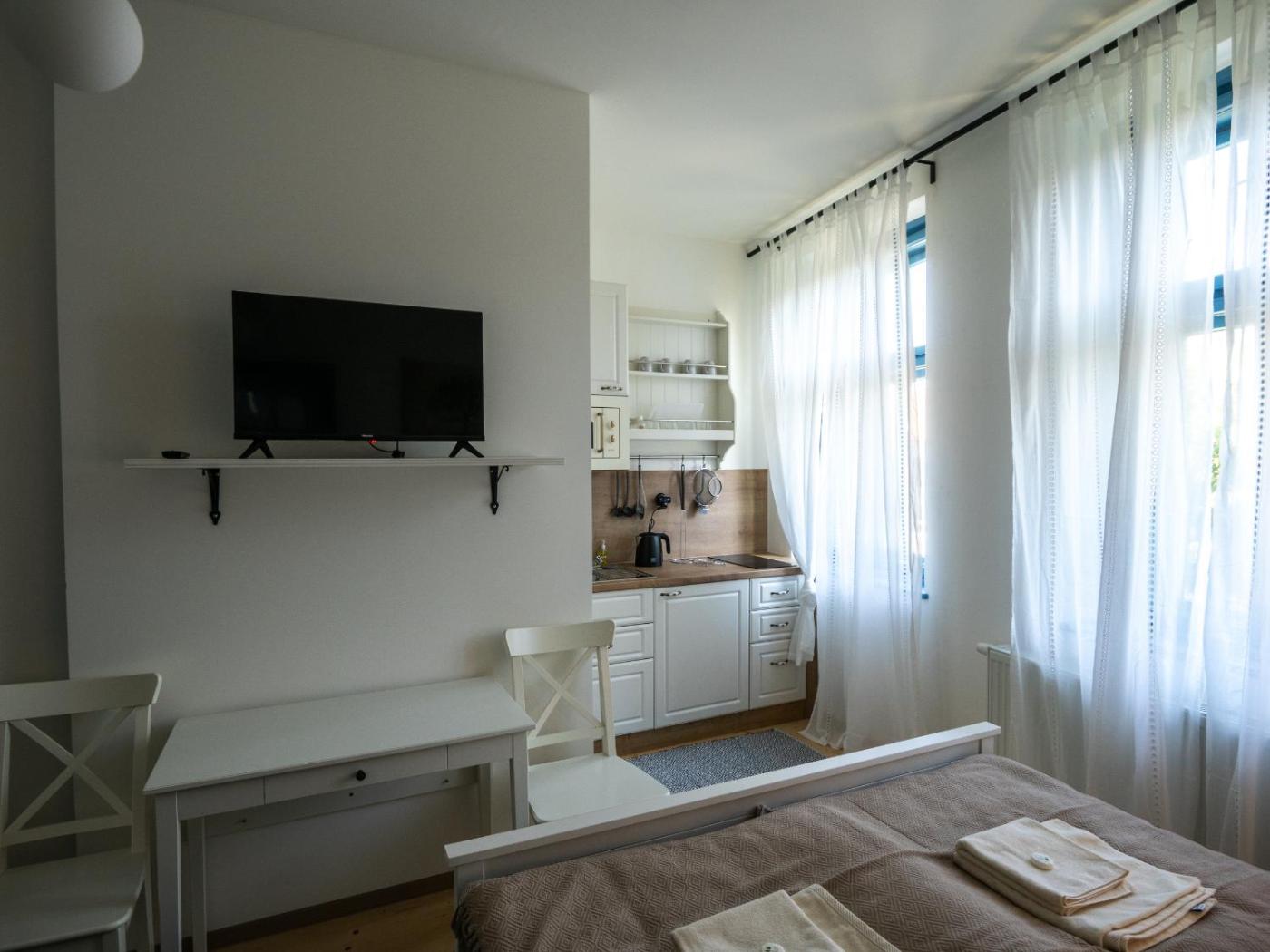 King Studio with Sofa Bed. Offering free toiletries, this studio includes a private bathroom with a shower and slippers. In the kitchenette, guests will find a stovetop, a refrigerator, kitchenware and a microwave. The studio has parquet floors, a seating area with a flat-screen TV with cable channels, a private entrance, a wardrobe, as well as an electric kettle. The unit has 2 beds. ;