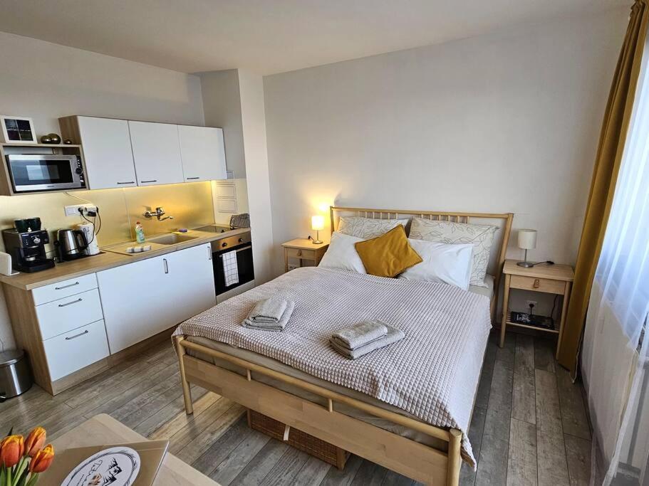 One-Bedroom Apartment. The apartment features 1 bedroom and 1 bathroom with a shower and free toiletries. Guests can make meals in the kitchen that is equipped with a stovetop, a refrigerator, kitchenware and a microwave. This apartment has a tea and coffee maker, heating, a flat-screen TV with streaming services and a balcony. The unit offers 2 beds.